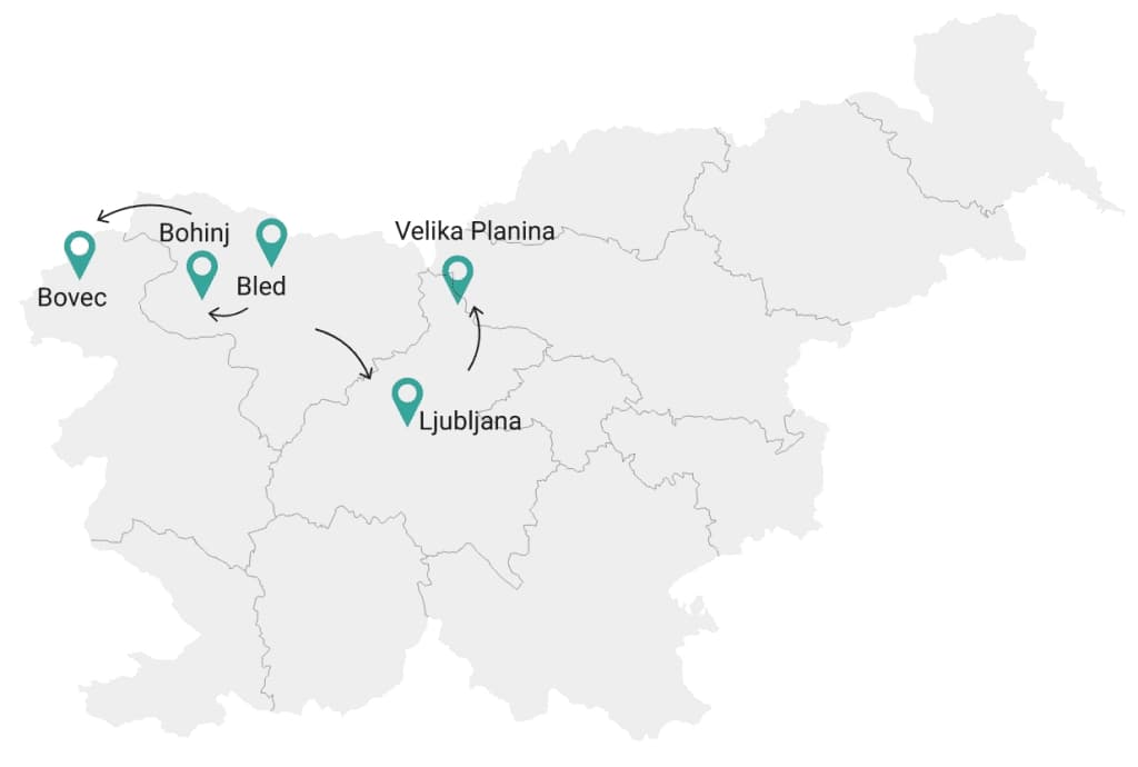 For at tage alt skønheden i Soča-dalen ind, vil vi besøge Virje-vandfaldet, vandre til Soča-flodens kilde og beundre den magiske Šunik-vandlund. En naturskøn tur over Vršič-bjergepasset vil tage os til hovedstaden Ljubljana. Der vil vi udforske den berømte arkitektur med en cykeltur og føle byens livlige stemning. Sidst men ikke mindst vil vi tage dig tilbage i tiden på de høje græsgange i Velika Planina, hvor du vil blive ført tilbage i tiden af en unik hyrdeby.