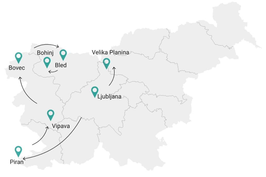 - Höhepunkte wie Velika Planina, Bohinj, Pokljuka, Kranjska Gora, Soča-Tal und mehr